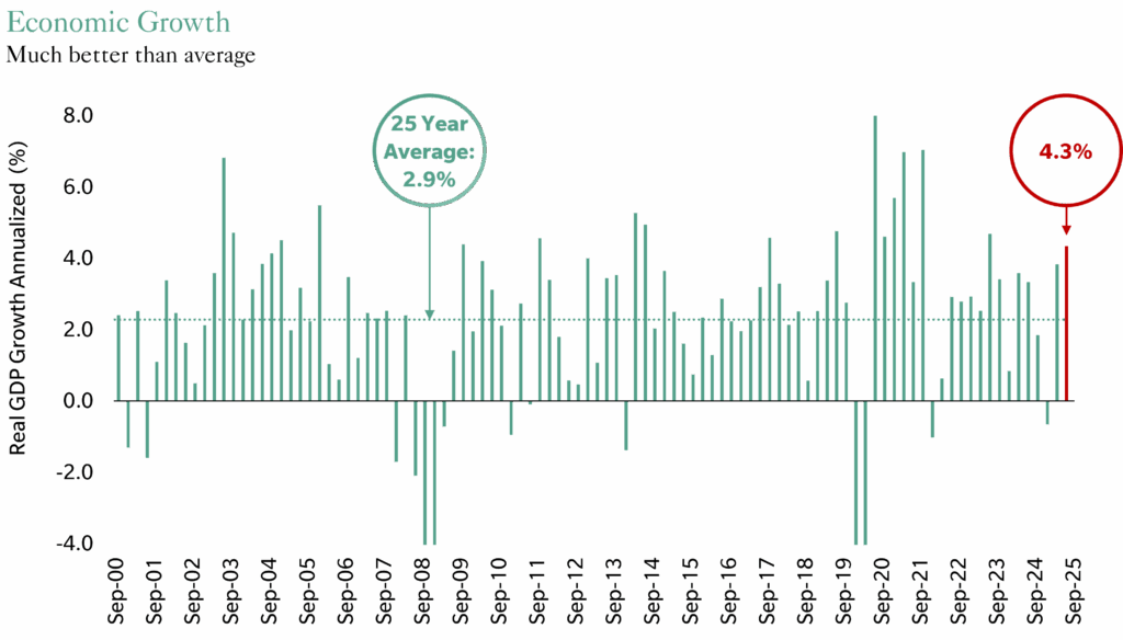 Recent GDP growth above 4% is much higher than the average over the past quarter-century, and momentum is expected to carry forward. Our base case is continued above-average growth; even a more pessimistic scenario would still likely avoid a recession.